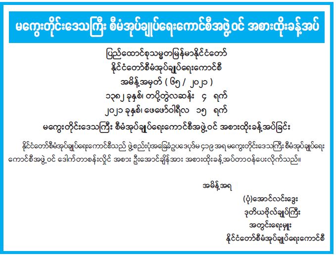 မကွေးတိုင်းဒေသကြီး စီမံအုပ်ချုပ်ရေး ကောင်စီအဖွဲ့ဝင် အစားထိုးခန့်အပ် 02/16/2021 မကွေးတိုင်းဒေသကြီး စီမံအုပ်ချုပ်ရေး ကောင်စီအဖွဲ့ဝင် အစားထိုးခန့်အပ်