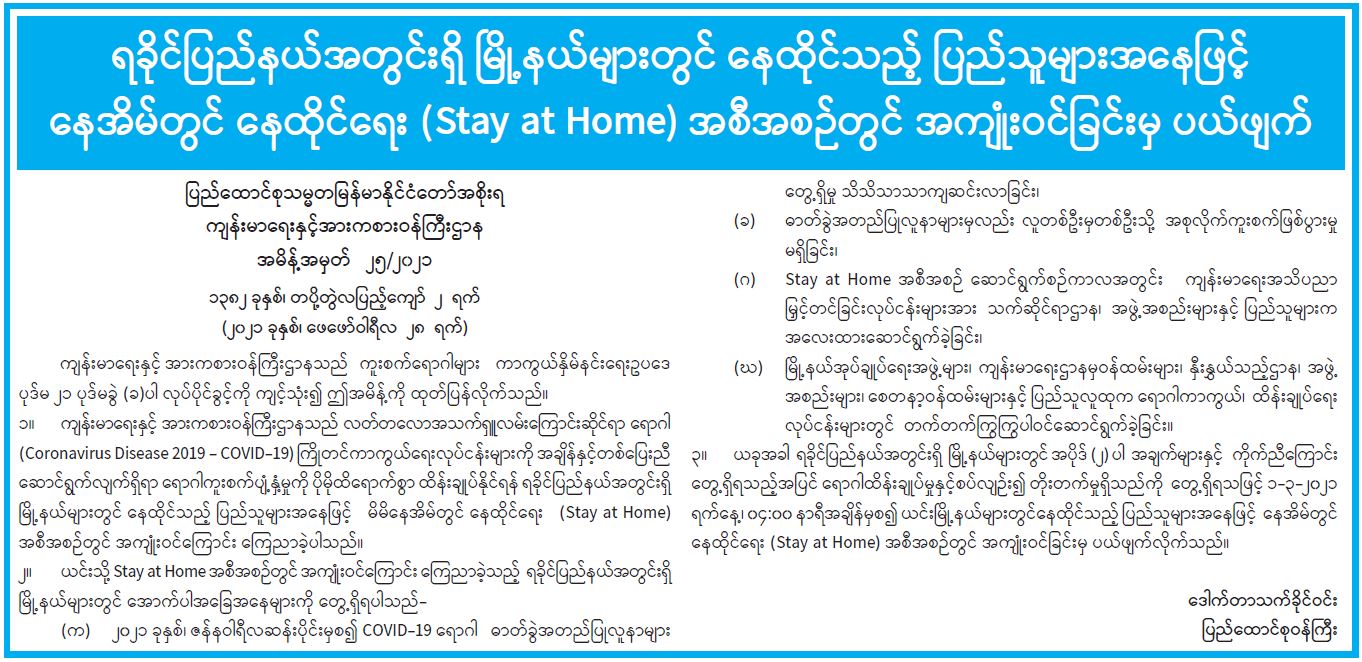 ရခိုင်ပြည်နယ်အတွင်းရှိ မြို့နယ်များတွင် နေထိုင်သည့် ပြည်သူများအနေဖြင့် နေအိမ်တွင် နေထိုင်ရေး (Stay at Home) အစီအစဉ်တွင် အကျုံးဝင်ခြင်းမှ ပယ်ဖျက် 03/01/2021