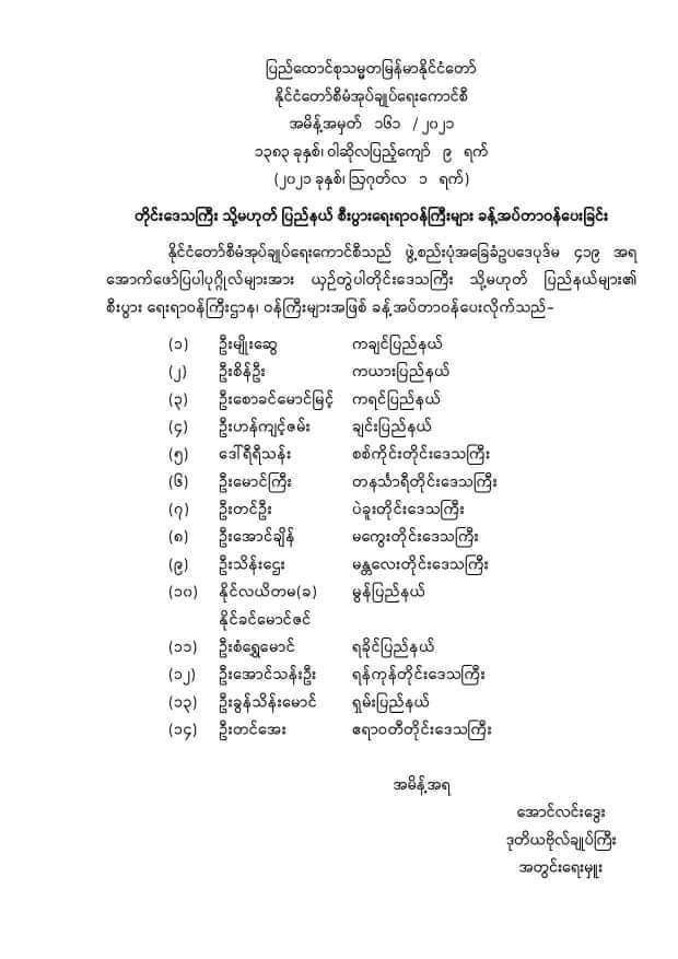 တိုင်းဒေသကြီး သို့မဟုတ် ပြည်နယ်စီးပွားရေးရာဝန်ကြီးများ ခန့်အပ်တာဝန်ပေးခြင်း