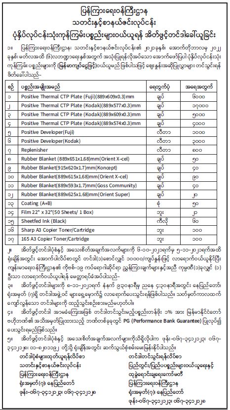 သတင်းနှင့်စာနယ်ဇင်းလုပ်ငန်း ပုံနှိပ်လုပ်ငန်းသုံးကုန်ကြမ်းပစ္စည်းများဝယ်ယူရန် အိတ်ဖွင့်တင်ဒါခေါ်ယူခြင်း