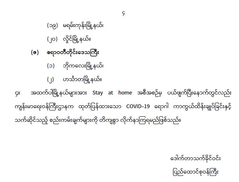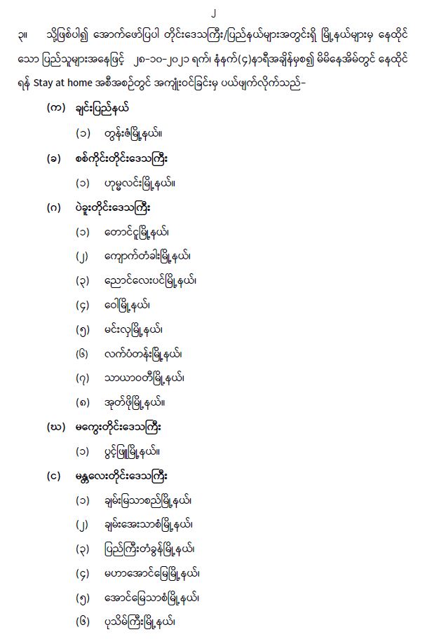 တိုင်းဒေသကြီး/ပြည်နယ်များအတွင်းရှိ ဖော်ပြပါ မြို့နယ် ၄၄ မြို့နယ်အား Stay at home အစီအစဉ်တွင် အကျုံးဝင်ခြင်းမှ ပယ်ဖျက်