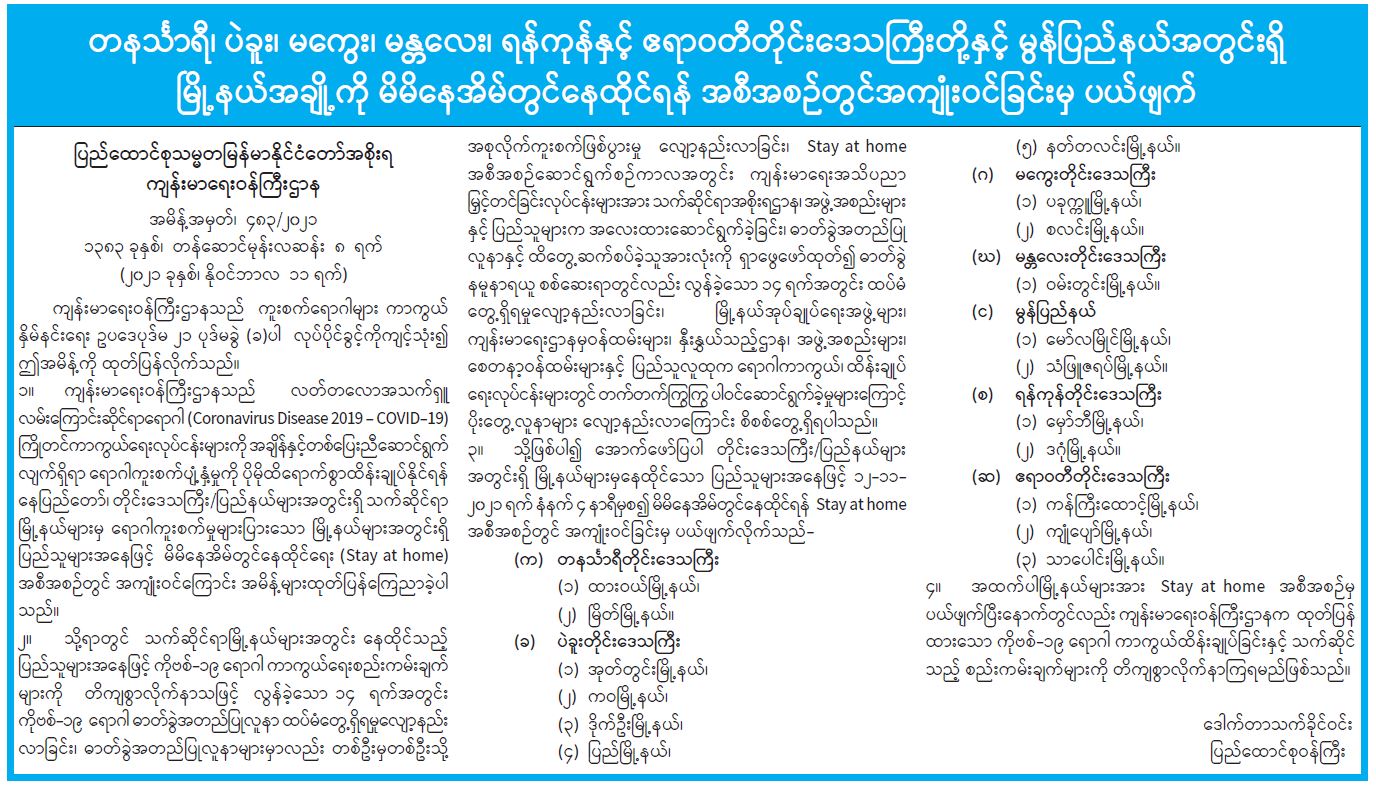 တနင်္သာရီ၊ ပဲခူး၊ မကွေး၊ မန္တလေး၊ ရန်ကုန်နှင့် ဧရာဝတီတိုင်းဒေသကြီးတို့နှင့် မွန်ပြည်နယ်အတွင်းရှိ မြို့နယ်အချို့ ကို မိမိနေအိမ်တွင်နေထိုင်ရန် အစီအစဉ်တွင်အကျုံးဝင်ခြင်းမှ ပယ်ဖျက်