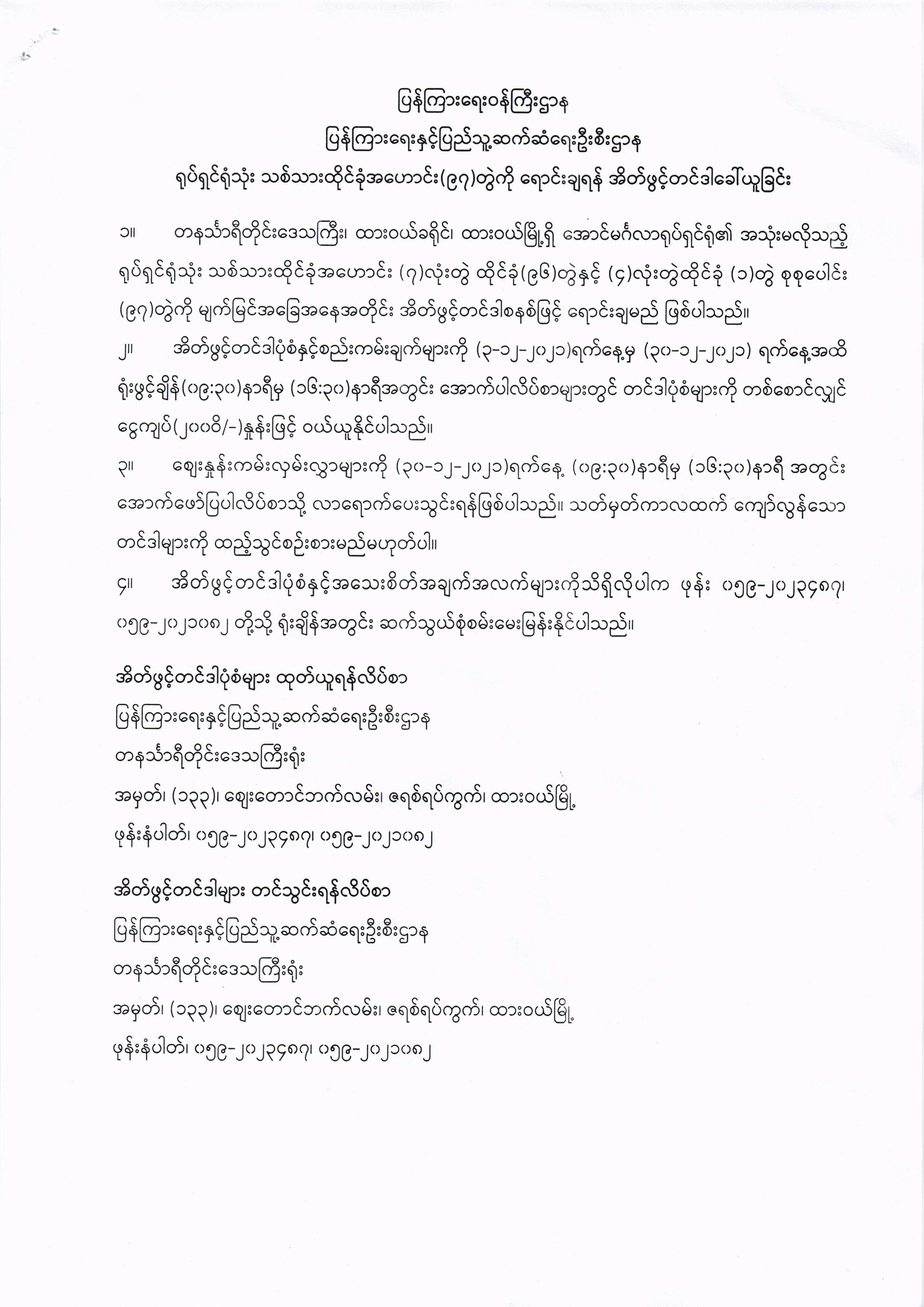 ရုပ်ရှင်ရုံသုံး သစ်သားထိုင်ခုံအဟောင်း (၉၇) တွဲကို ရောင်းချရန် အိတ်ဖွင့်တင်ဒါခေါ်ယူခြင်း