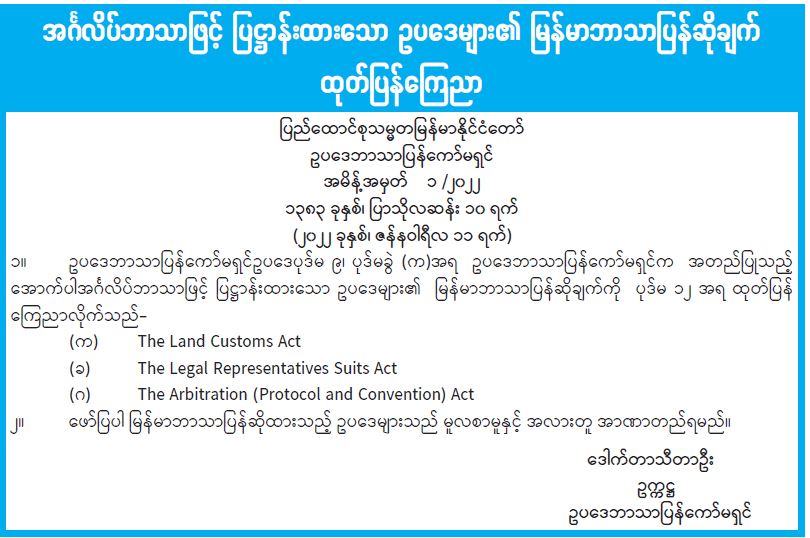 ဥပဒေဘာသာပြန်ကော်မရှင် အမိန့်အမှတ် ၁/၂၀၂၂ ထုတ်ပြန် 01/13/2022 ဥပဒေဘာသာပြန်ကော်မရှင် အမိန့်အမှတ် ၁/၂၀၂၂ ထုတ်ပြန်