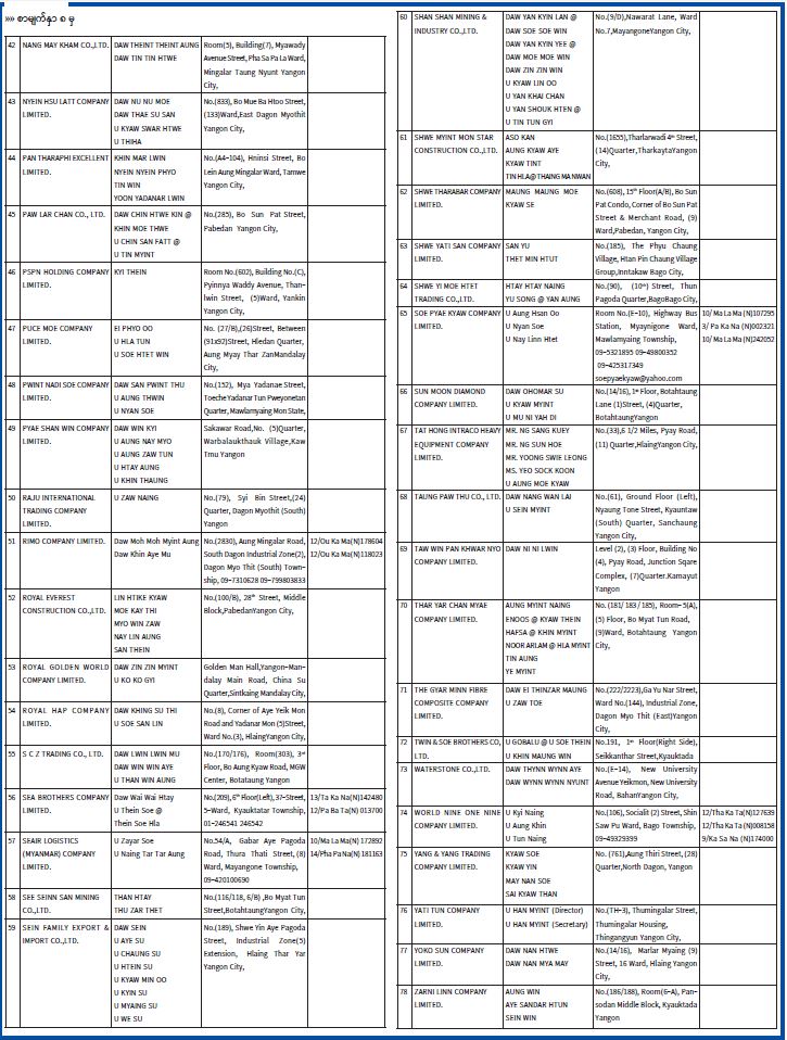 ၅။ အဆိုပါကုမ္ပဏီ(၁၅၈)ခု (ပူးတွဲစာရင်း) အား နိုင်ငံခြားသုံးငွေစီမံခန့်ခွဲမှုဥပဒေ ပုဒ်မ ၄၂-က အရ အရေးယူဆောင်ရွက်လျက်ရှိပြီး ကုမ္ပဏီများနှင့် ပူးတွဲဖော်ပြထားသည့် ကုမ္ပဏီများ၏ ဒါရိုက်တာအဖွဲ့ဝင်များအား အမည်မည်းစာရင်းထည့်သွင်းကြောင်းနှင့် ကျန်ရှိနေသေးသည့် ပို့ကုန်ရငွေဝင်ရောက်ရန် ကျန်ကုမ္ပဏီများအားလည်း အရေးယူဆောင်ရွက်ရန် ဆက်လက်စိစစ်လျက်ရှိကြောင်း ကြေညာပါသည်။