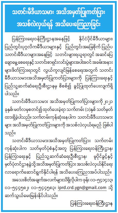သတင်းမီဒီယာသမား အသိအမှတ်ပြုကတ်ပြား အသစ်လဲလှယ်ရန် အသိပေးကြေညာခြင်း 07/29/2022 သတင်းမီဒီယာသမား အသိအမှတ်ပြုကတ်ပြား အသစ်လဲလှယ်ရန် အသိပေးကြေညာခြင်း