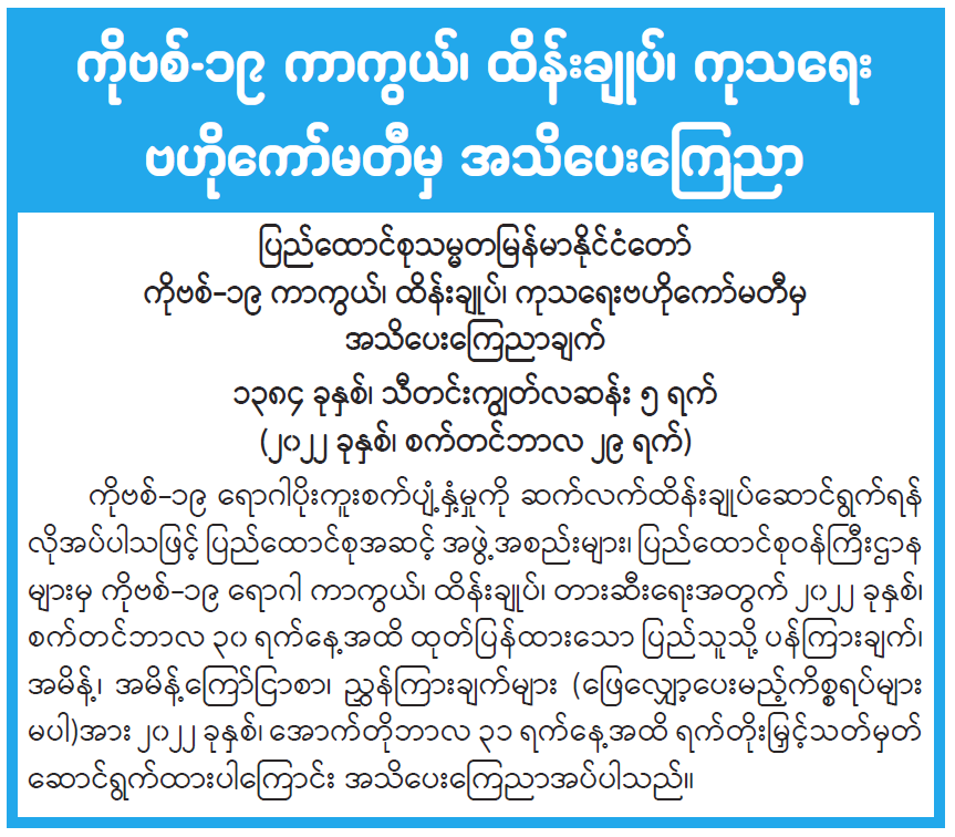 ကိုဗစ်-၁၉ ကာကွယ်၊ ထိန်းချုပ်၊ ကုသရေး ဗဟိုကော်မတီမှ အသိပေးကြေညာ