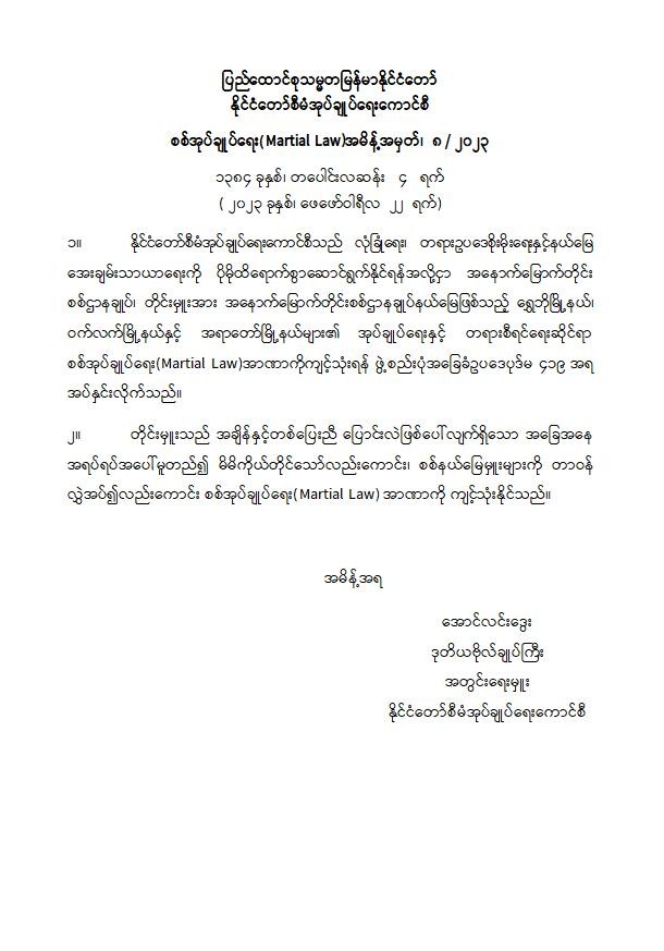 ပြည်ထောင်စုသမ္မတမြန်မာနိုင်ငံတော် နိုင်ငံတော်စီမံအုပ်ချုပ်ရေးကောင်စီ စစ်အုပ်ချုပ်ရေး(Martial Law)အမိန့်အမှတ်၊ ၈ / ၂၀၂၃