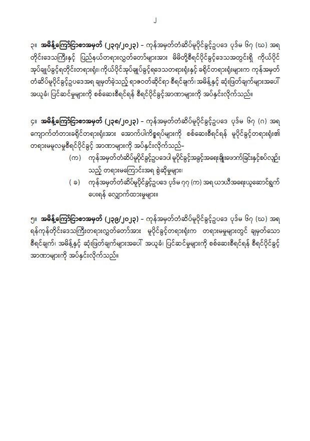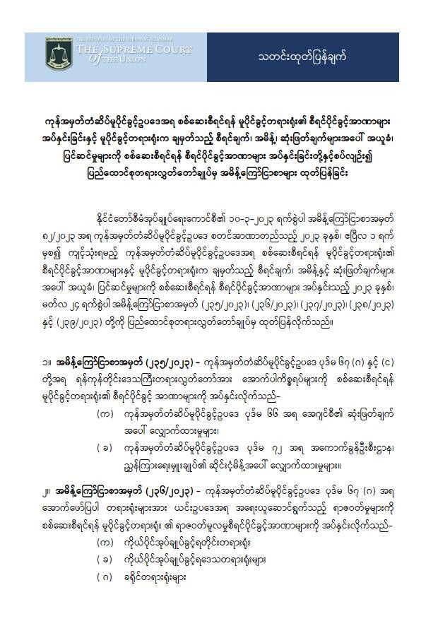 ကုန်အမှတ်တံဆိပ်မူပိုင်ခွင့်ဥပဒေအရ စစ်ဆေးစီရင်ရန် မူပိုင်ခွင့်တရားရုံး၏ စီရင်ပိုင်ခွင့်အာဏာများ အပ်နှင်းခြင်းနှင့် မူပိုင်ခွင့်တရားရုံးက ချမှတ်သည့် စီရင်ချက်၊ အမိန့်၊ ဆုံးဖြတ်ချက်များအပေါ် အယူခံ၊ ပြင်ဆင်မှုများကို စစ်ဆေးစီရင်ရန် စီရင်ပိုင်ခွင့်အာဏာများ အပ်နှင်းခြင်းတို့နှင့်စပ်လျဉ်း၍ ပြည်ထောင်စုတရားလွှတ်တော်ချုပ်မှ အမိန့်ကြော်ငြာစာများ ထုတ်ပြန်ခြင်း
