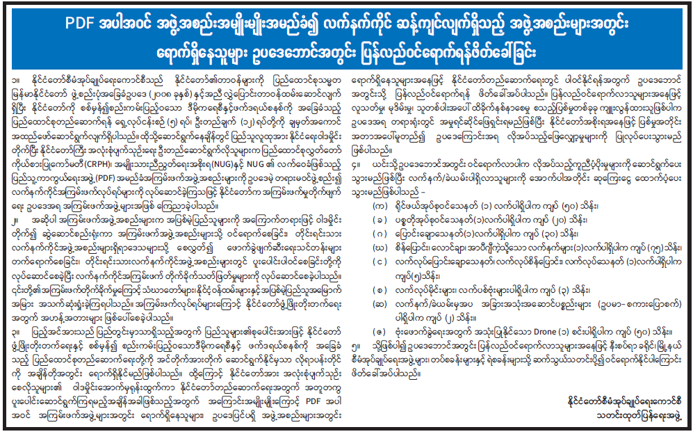 PDF အပါအဝင် အဖွဲ့အစည်းအမျိုးမျိုးအမည်ခံ၍ လက်နက်ကိုင် ဆန့်ကျင်လျက်ရှိသည့် အဖွဲ့အစည်းများအတွင်း ရောက်ရှိနေသူများ ဥပဒေဘောင်အတွင်း ပြန်လည်ဝင်ရောက်ရန်ဖိတ်ခေါ်ခြင်း 05/14/2023