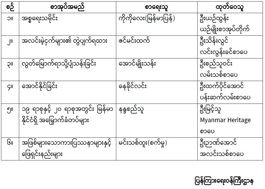 ပုံနှိပ်ခြင်းနှင့်ထုတ်ဝေခြင်းလုပ်ငန်းဥပဒေအရ ထုတ်ဝေသူသည် မိမိထုတ်ဝေသော ထုတ်ဝေစာ ၅ အုပ် သို့မဟုတ် ၅ စောင်ကို ဖြန့်ချိသည့်နေ့မှစ၍ ၁၄ ရက်အတွင်း ပုံစံ (၁၁)ဖြင့် ပြန်ကြားရေးဝန်ကြီးဌာန၊ ပြန်ကြားရေးနှင့်ပြည်သူ့ဆက်ဆံရေးဦးစီးဌာန၊ မူပိုင်ခွင့်နှင့်မှတ်ပုံတင်ဌာနခွဲသို့ ပေးပို့အပ်နှံရမည်ဖြစ်ပါ သည်။ ယခုအခါ အောက်ဖော်ပြပါထုတ်ဝေသူများသည် ပုံနှိပ်ခြင်းနှင့်ထုတ်ဝေခြင်းလုပ်ငန်းဥပဒေနှင့်အညီ မူပိုင်ခွင့်နှင့်မှတ်ပုံတင်ဌာနခွဲသို့ ပေးပို့အပ်နှံရန် ပျက်ကွက်လျက်ရှိပါသဖြင့် အမြန်ဆုံးပေးအပ်နိုင်ပါရန် အသိပေးကြေညာအပ်ပါသည်-