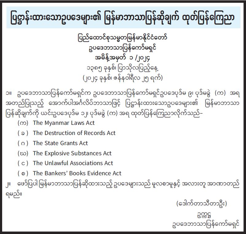 ပြဋ္ဌာန်းထားသောဥပဒေများ၏ မြန်မာဘာသာပြန်ဆိုချက် ထုတ်ပြန်ကြေညာ