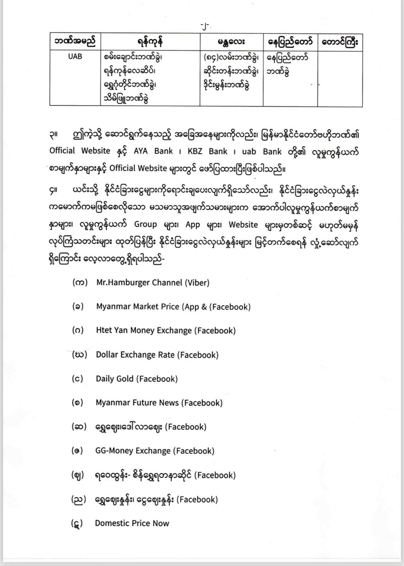 မဟုတ်မမှန်လုပ်ကြံသတင်းများ ထုတ်ပြန်ပြီး နိုင်ငံခြားငွေလဲလှယ်နှုန်းများ မြင့်တက်စေရန် လှုံ့ဆော်သူများကို တည်ဆဲဥပဒေများနှင့်အညီ တရားစွဲအရေးယူနိုင်ရေးအတွက် တရားဥပဒေ စိုးမိုးရေးအဖွဲ့အစည်းများနှင့် ပူးပေါင်းဆောင်ရွက်လျက်ရှိကြောင်း သတင်းထုတ်ပြန်ခြင်း