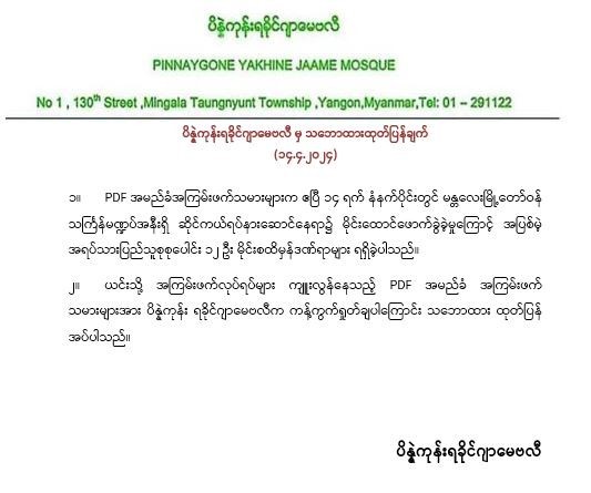 ပိန္နဲကုန်းရခိုင်ဂျာမေဗလီမှ သဘောထားထုတ်ပြန်ချက်