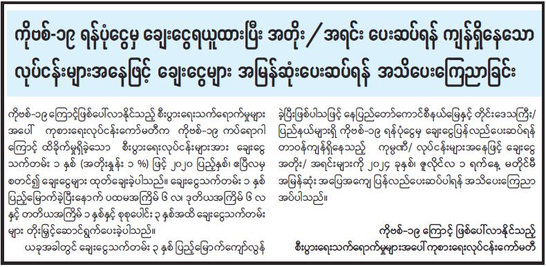 ယခုအခါတွင် ချေးငွေသက်တမ်း ၃ နှစ် ပြည့်မြောက်ကျော်လွန် ခဲ့ပြီးဖြစ်ပါသဖြင့် နေပြည်တော်ကောင်စီနယ်မြေနှင့် တိုင်းဒေသကြီး/ ပြည်နယ်များရှိ ကိုဗစ်-၁၉ ရန်ပုံငွေမှ ချေးငွေပြန်လည်ပေးဆပ်ရန် တာဝန်ကျန်ရှိနေသည့် ကုမ္ပဏီ/ လုပ်ငန်းများအနေဖြင့် ချေးငွေအတိုး/ အရင်းများကို ၂၀၂၄ ခုနှစ်၊ ဇူလိုင်လ ၁ ရက်နေ့ မတိုင်မီ အမြန်ဆုံးအပြေအကျေ ပြန်လည်ပေးဆပ်ပါရန် အသိပေးကြေညာအပ်ပါသည်။