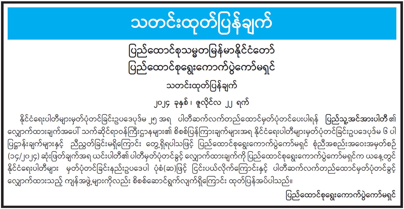 သတင်းထုတ်ပြန်ချက်၊ ပြည်ထောင်စုသမ္မတမြန်မာနိုင်ငံတော် ပြည်ထောင်စုရွေးကောက်ပွဲကော်မရှင် သတင်းထုတ်ပြန်ချက်