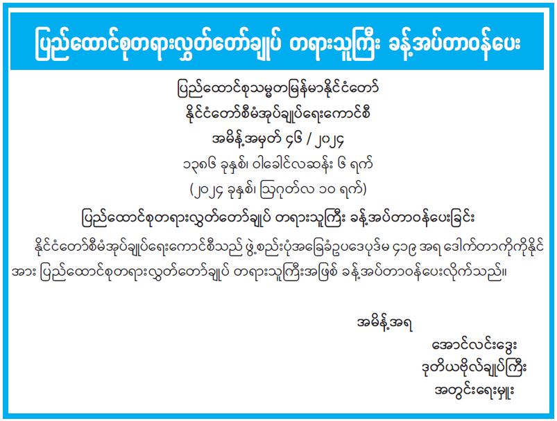 ပြည်ထောင်စုတရားလွှတ်တော်ချုပ် တရားသူကြီး ခန့်အပ်တာဝန်ပေး