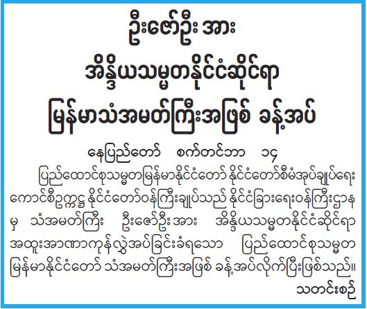 ဦးဇော်ဦး အား အိန္ဒိယသမ္မတနိုင်ငံဆိုင်ရာ မြန်မာသံအမတ်ကြီးအဖြစ် ခန့်အပ်