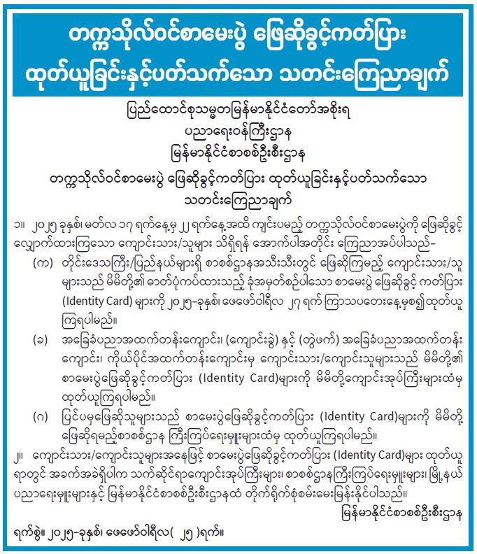 တက္ကသိုလ်ဝင်စာမေးပွဲ ဖြေဆိုခွင့်ကတ်ပြား ထုတ်ယူခြင်းနှင့်ပတ်သက်သော သတင်းကြေညာချက်