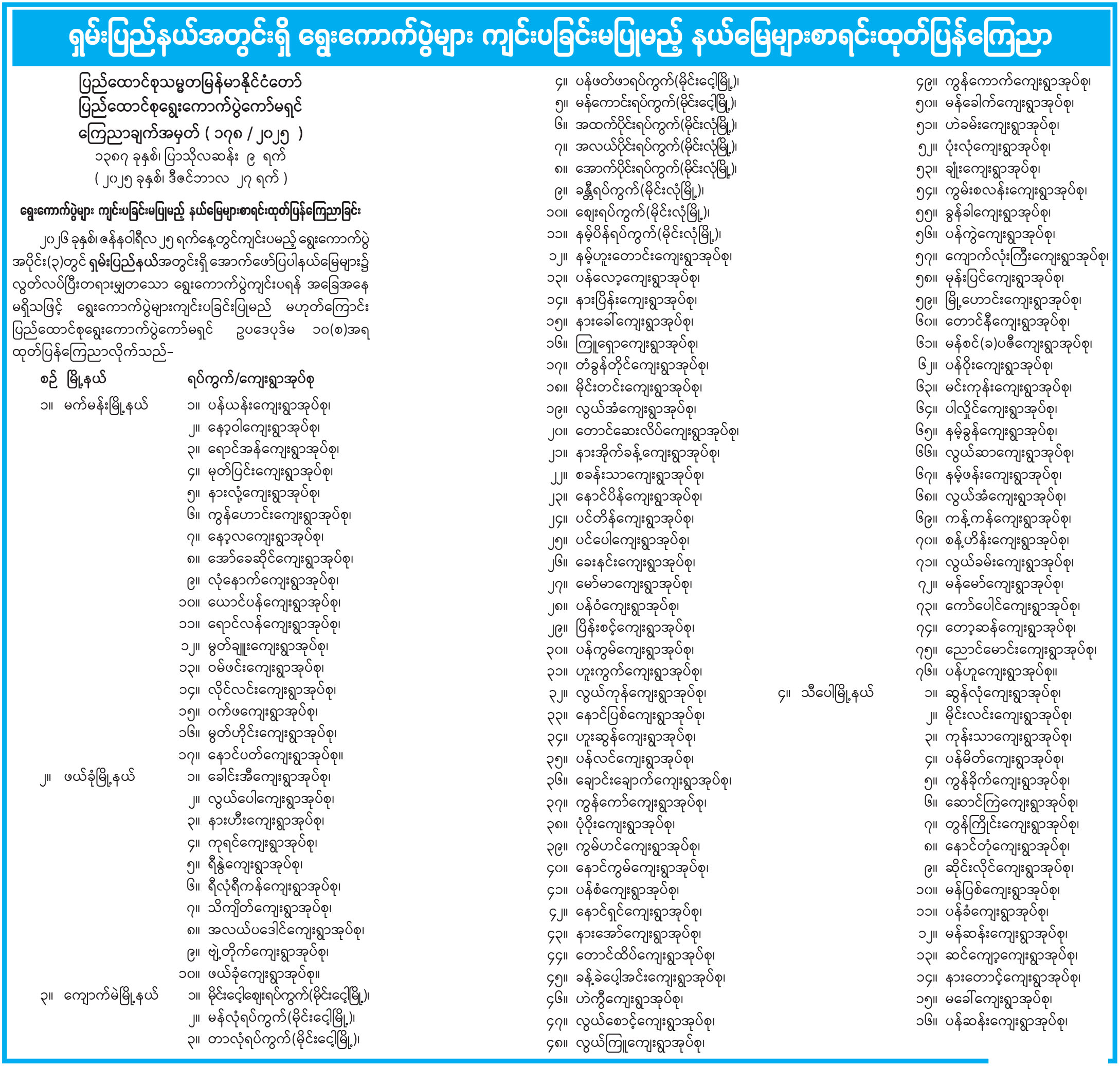 ရှမ်းပြည်နယ်အတွင်း ရွေးကောက်ပွဲများကျင်းပခြင်းမပြုမည့် နယ်မြေများစာရင်း ထုတ်ပြန်ကြေညာ