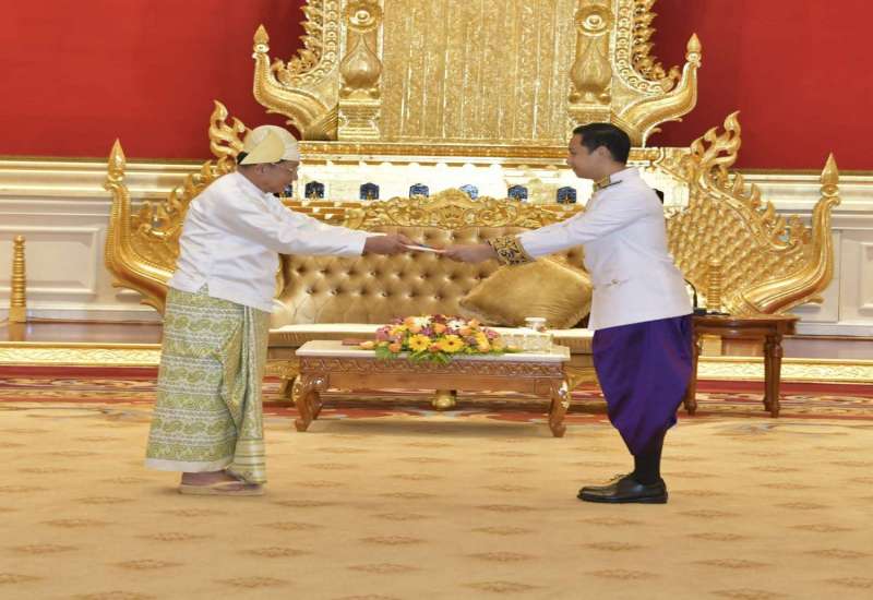 နိုင်ငံတော်စီမံအုပ်ချုပ်ရေးကောင်စီဥက္ကဋ္ဌ နိုင်ငံတော်ဝန်ကြီးချုပ် ဗိုလ်ချုပ်မှူးကြီး မင်းအောင်လှိုင် ထံ မြန်မာနိုင်ငံဆိုင်ရာ ကမ္ဘောဒီးယားနိုင်ငံသံအမတ်ကြီးအဖြစ် ခန့်အပ်ရန်သဘောတူညီပြီးဖြစ်သော သံအမတ်ကြီး H.E. Mr. CHUM Angvichet သည် ယနေ့နံနက် ၁၀ နာရီတွင် နေပြည်တော်ရှိ နိုင်ငံတော်စီမံအုပ်ချုပ်ရေးကောင်စီဥက္ကဋ္ဌရုံး၊ သံတမန်ဆောင်ဧည့်ခန်းမ၌ ၎င်း၏ သံအမတ်ခန့်အပ်လွှာကို ပေးအပ်သည်။