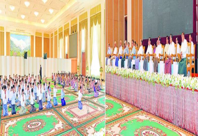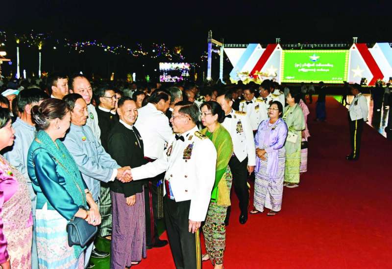 နိုင်ငံတော်စီမံအုပ်ချုပ်ရေးကောင်စီဥက္ကဋ္ဌ တပ်မတော်ကာကွယ်ရေးဦးစီးချုပ် ဗိုလ်ချုပ်မှူးကြီး မင်းအောင်လှိုင်နှင့်ဇနီး ဒေါ်ကြူကြူလှတို့က တည်ခင်းဧည့်ခံသည့် ၂၀၂၃ ခုနှစ်၊ (၇၈) နှစ်မြောက် တပ်မတော်နေ့အထိမ်းအမှတ်ဧည့်ခံပွဲနှင့် ဂုဏ်ပြုညစာစားပွဲ အခမ်းအနားကို ယနေ့ညပိုင်းတွင် နေပြည်တော်ရှိဇေယျာသီရိဗိမာန် ဥပစာရင်ပြင်၌ ကျင်းပပြုလုပ်သည်။