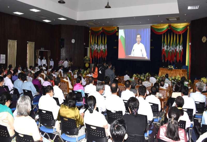 နိုင်ငံတော်စီမံအုပ်ချုပ်ရေးကောင်စီအစည်းအဝေး (၂/၂၀၂၃) ကို ယနေ့မွန်းလွဲပိုင်းတွင် နေပြည်တော်ရှိ နိုင်ငံတော်စီမံအုပ်ချုပ်ရေးကောင်စီဥက္ကဋ္ဌရုံး အစည်းအဝေးခန်းမ၌ ကျင်းပပြုလုပ်ရာ နိုင်ငံတော်စီမံအုပ်ချုပ်ရေးကောင်စီဥက္ကဋ္ဌ နိုင်ငံတော်ဝန်ကြီးချုပ် ဗိုလ်ချုပ်မှူးကြီး မင်းအောင်လှိုင် တက်ရောက်အမှာစကားပြောကြားသည်။