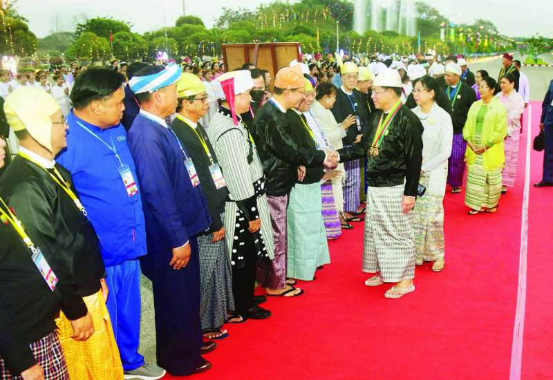 ပြည်ထောင်စုသမ္မတမြန်မာနိုင်ငံတော် နိုင်ငံတော်စီမံအုပ်ချုပ်ရေးကောင်စီဥက္ကဋ္ဌ နိုင်ငံတော်ဝန်ကြီးချုပ် ဗိုလ်ချုပ်မှူးကြီး သတိုးမဟာသရေစည်သူ၊ သတိုးသီရိသုဓမ္မ မင်းအောင်လှိုင်နှင့် ဇနီးဒေါ်ကြူကြူလှတို့က တည်ခင်းဧည့်ခံသည့် ၂၀၂၃ ခုနှစ် (၇၆) နှစ်မြောက် ပြည်ထောင်စုနေ့အထိမ်းအမှတ် ဂုဏ်ပြုညစာစားပွဲအခမ်းအနားကို ယနေ့ညပိုင်းတွင် နေပြည်တော်ရှိ မြို့တော်ခန်းမဥပစာရင်ပြင်၌ ကျင်းပသည်။
