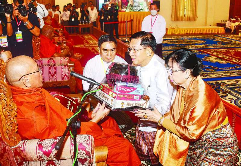 ၂၀၂၃ ခုနှစ်၊ သာသနာတော်ဆိုင်ရာ ဘွဲ့တံဆိပ်တော် ဆက်ကပ်ခံယူတော်မူမည့် ဆရာတော်ကြီးများအား ယနေ့နံနက်ပိုင်းတွင် နေပြည်တော် ဥပ္ပါတသန္တိစေတီတော်မြတ်ကြီး ပရိဝုဏ်အတွင်းရှိ သာသနာ့မဟာဗိမာန်တော်ကြီး၌ ပြည်ထောင်စုသမ္မတမြန်မာနိုင်ငံတော် နိုင်ငံတော်စီမံအုပ်ချုပ်ရေးကောင်စီဥက္ကဋ္ဌ နိုင်ငံတော်ဝန်ကြီးချုပ် ဗိုလ်ချုပ်မှူးကြီး မင်းအောင်လှိုင်နှင့် ဇနီး ဒေါ်ကြူကြူလှတို့က နေ့ဆွမ်းဆက်ကပ်လှူဒါန်းသည်။
