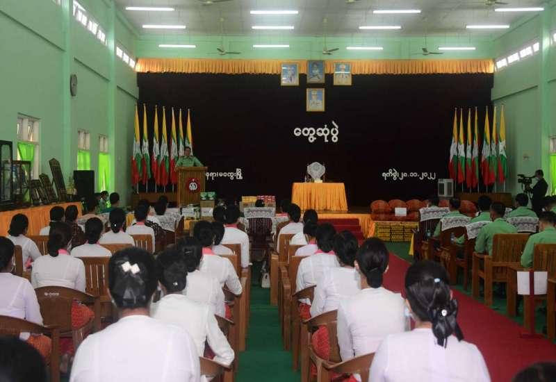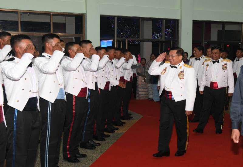 စစ်တက္ကသိုလ် ဗိုလ်လောင်းသင်တန်းအမှတ်စဉ် (၆၄) သင်တန်းဆင်းဂုဏ်ပြု ညစာစားပွဲ အခမ်းအနားကို ယနေ့ညနေပိုင်းတွင် ပြင်ဦးလွင်မြို့၊ စစ်တက္ကသိုလ်၊ အနော်ရထာတပ်ရင်း ဗိုလ်လောင်းစားရိပ်သာ၌ ကျင်းပပြုလုပ်ရာ နိုင်ငံတော်စီမံအုပ်ချုပ်ရေးကောင်စီဥက္ကဋ္ဌ တပ်မတော်ကာကွယ်ရေးဦးစီးချုပ် ဗိုလ်ချုပ်မှူးကြီး မင်းအောင်လှိုင် တက်ရောက်ချီးမြှင့်သည်။