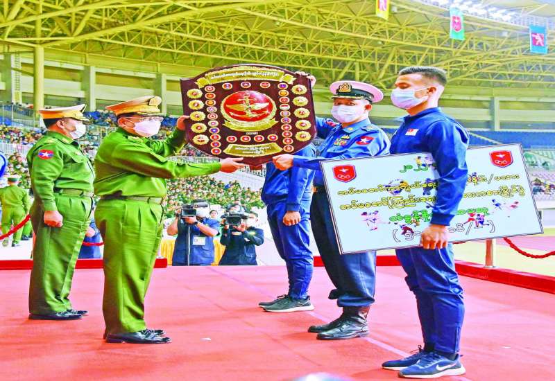၂၀၂၂ ခုနှစ်၊ တပ်မတော်(ကြည်း၊ ရေ၊ လေ)အားကစားပြိုင်ပွဲ ဆုချီးမြှင့်ပွဲအခမ်းအနားကို ယနေ့ညနေပိုင်းတွင် နေပြည်တော်ရှိ ဇေယျာသီရိတပ်မတော်အားကစားကွင်း၌ ကျင်းပပြုလုပ်ရာ နိုင်ငံတော်စီမံအုပ်ချုပ်ရေးကောင်စီဥက္ကဋ္ဌ တပ်မတော်ကာကွယ်ရေးဦးစီးချုပ် ဗိုလ်ချုပ်မှူးကြီး မင်းအောင်လှိုင် တက်ရောက်အားပေး၍ ဆုများပေးအပ်ချီးမြှင့်သည်။
