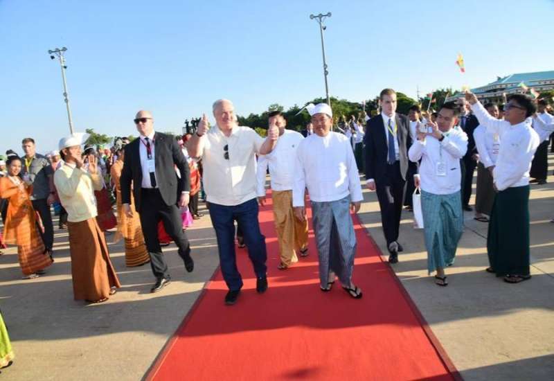 ပြည်ထောင်စုသမ္မတမြန်မာနိုင်ငံတော်ယာယီသမ္မတ နိုင်ငံတော်လုံခြုံရေးနှင့်အေးချမ်းသာယာရေးကော်မရှင်ဥက္ကဋ္ဌ ဗိုလ်ချုပ်မှူးကြီး မင်းအောင်လှိုင်သည် မြန်မာနိုင်ငံသို့ တရားဝင်ချစ်ကြည်ရေးခရီး ရောက်ရှိလာသော ဘယ်လာရုစ်သမ္မတနိုင်ငံသမ္မတ H.E. Mr. Aleksandr Lukashenko အား ယနေ့နံနက်ပိုင်းတွင် သမ္မတအိမ်တော် ဆင်ဖြူတော်ဆောင်ဧည့်ခန်းမ၌ ဂုဏ်ပြုတပ်ဖွဲ့ဖြင့် ကြိုဆိုသည်။