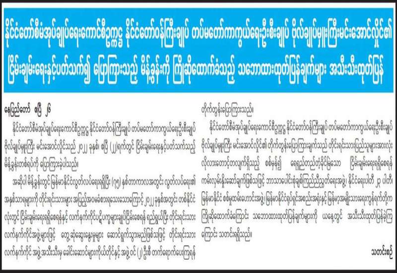 နှစ်ဟောင်းကနေနှစ်သစ်ကိုကူးတဲ့ ဒီလိုအချိန်ခါမှာ ပြည်ထောင်စုအတွင်းမှာရှိတဲ့တိုင်းရင်းသားပြည်သူ ညီအစ်ကိုမောင်နှမများအားလုံး ကိုယ်စိတ်နှစ်ဖြာကျန်းမာချမ်းသာကြပါစေ၊ ကောင်းကျိုးလိုအင် ဆန္ဒများပြည့်ဝကြပါစေလို့ ဆုမွန်ကောင်းတောင်းအပ်ပါတယ် ခင်ဗျား။
