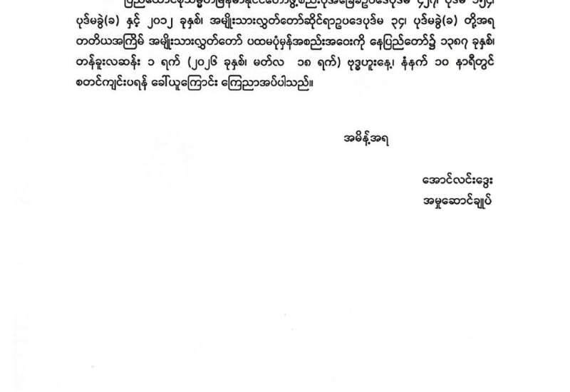 တတိယအကြိမ် အမျိုးသားလွှတ်တော် ပထမပုံမှန်အစည်းအဝေးတက်ရောက်ရန်အတွက် အမျိုးသားလွှတ်တော်ကိုယ်စားလှယ်များ သတင်းပို့ကြရန် အမျိုးသားလွှတ်တော်ထုတ်ပြန်