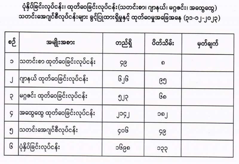 ၁။ နိုင်ငံတော်စီမံအုပ်ချုပ်ရေးကောင်စီ၏ လမ်းညွှန်မှုဖြင့် ဆီစက်လုပ်ငန်းများဖွံ့ဖြိုးရေး ချေးငွေစီမံခန့်ခွဲမှုအဖွဲ့သည် ပြည်တွင်းရှိ ဆီစက်များသို့ အဆင့်မီစက်ပစ္စည်းများ တိုးချဲ့တပ်ဆင်ခြင်း၊ အဆင့်မြှင့်တင်ခြင်း၊ ခေတ်မီဆီစက်အသစ်များ ထပ်မံတည်ဆောက်ခြင်းနှင့် လုပ်ငန်းသုံး ရင်းနှီးလည်ပတ်ငွေလိုအပ်ချက်များအတွက် နိုင်ငံ့စီးပွားမြှင့်တင်ရေးရန်ပုံငွေမှ မတည်ထူထောင်ထားသည့် ဆီစက်လုပ်ငန်းများဖွံ့ဖြိုးရေးချေးငွေရန်ပုံငွေမှ အတိုးနှုန်းသက်သာမှုရှိသော ချေးငွေများကို ထုတ်ချေးပေးလျက်ရှိပါသည်။