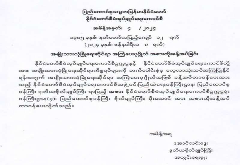 ပြည်ထောင်စုသမ္မတမြန်မာနိုင်ငံတော် နိုင်ငံတော်စီမံအုပ်ချုပ်ရေးကောင်စီ အမိန့်ကြော်ငြာစာအမှတ် ၁ / ၂၀၂၄ ၁၃၈၅ ခုနှစ် ၊ နတ်တော်လပြည့်ကျော် ၈ ရက် (၂၀၂၄ ခုနှစ်၊ ဇန်နဝါရီလ ၄ ရက်)