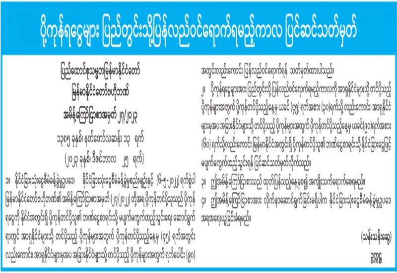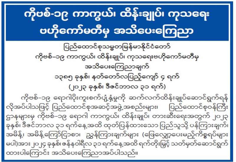ကိုဗစ်-၁၉ ရောဂါပိုးကူးစက်ပျံ့နှံ့မှုကို ဆက်လက်ထိန်းချုပ်ဆောင်ရွက်ရန် လိုအပ်ပါသဖြင့် ပြည်ထောင်စုအဆင့်အဖွဲ့အစည်းများ၊ ပြည်ထောင်စုဝန်ကြီးဌာနများမှ ကိုဗစ်-၁၉ ရောဂါ ကာကွယ်၊ ထိန်းချုပ်၊ တားဆီးရေးအတွက် ၂၀၂၃ ခုနှစ်၊ ဒီဇင်ဘာလ ၃၁ ရက်နေ့အထိ ထုတ်ပြန်ထားသော ပြည်သူသို့ ပန်ကြားချက်၊ အမိန့်၊ အမိန့်ကြော်ငြာစာ၊ ညွှန်ကြားချက်များ (ဖြေလျှော့ပေးမည့်ကိစ္စရပ်များမပါ) အား ၂၀၂၄ ခုနှစ်၊ ဇန်နဝါရီလ ၃၁ ရက်နေ့အထိ ရက်တိုးမြှင့် သတ်မှတ်ဆောင်ရွက်ထားပါကြောင်း အသိပေးကြေညာအပ်ပါသည်။