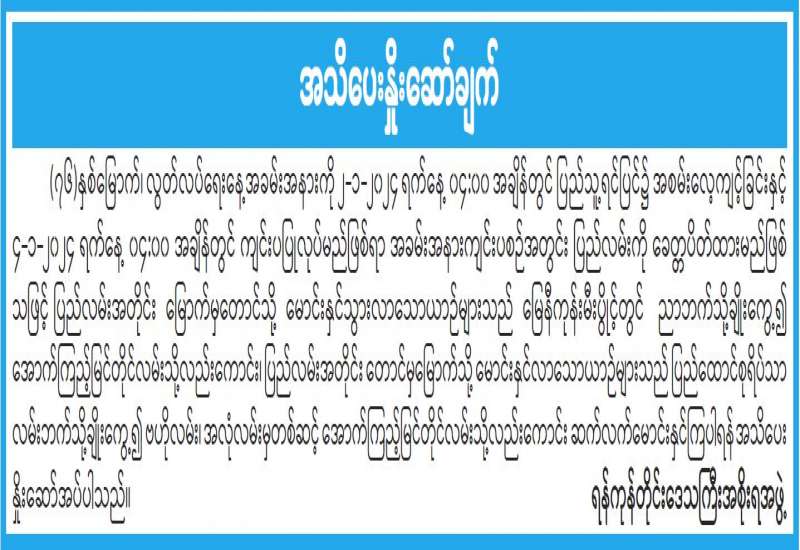 (၇၆)နှစ်မြောက်၊ လွတ်လပ်ရေးနေ့အခမ်းအနားကို ၂-၁-၂၀၂၄ ရက်နေ့ ၀၄:၀၀ အချိန်တွင် ပြည်သူ့ရင်ပြင်၌ အစမ်းလေ့ကျင့်ခြင်းနှင့် ၄-၁-၂၀၂၄ ရက်နေ့ ၀၄:၀၀ အချိန်တွင် ကျင်းပပြုလုပ်မည်ဖြစ်ရာ အခမ်းအနားကျင်းပစဉ်အတွင်း ပြည်လမ်းကို ခေတ္တပိတ်ထားမည်ဖြစ်သဖြင့် ပြည်လမ်းအတိုင်း မြောက်မှတောင်သို့ မောင်းနှင်သွားလာသောယာဉ်များသည် မြေနီကုန်းမီးပွိုင့်တွင် ညာဘက်သို့ချိုးကွေ့၍ အောက်ကြည့်မြင်တိုင်လမ်းသို့လည်းကောင်း၊ ပြည်လမ်းအတိုင်း တောင်မှမြောက်သို့ မောင်းနှင်လာသောယာဉ်များသည် ပြည်ထောင်စုရိပ်သာ လမ်းဘက်သို့ချိုးကွေ့၍ ဗဟိုလမ်း၊ အလုံလမ်းမှတစ်ဆင့် အောက်ကြည့်မြင်တိုင်လမ်းသို့လည်းကောင်း ဆက်လက်မောင်းနှင်ကြပါရန် အသိပေးနှိုးဆော်အပ်ပါသည်။