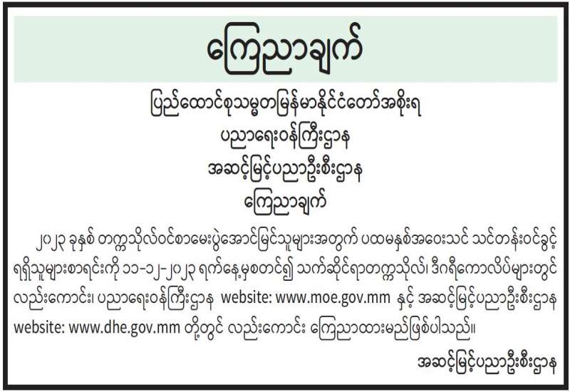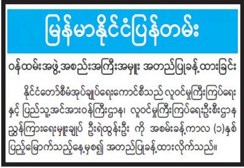 ​​​​​​​၂၀၁၄ ခုနှစ်၊ ပုံနှိပ်ခြင်းနှင့်ထုတ်ဝေခြင်းလုပ်ငန်းဥပဒေ၊ နည်းဥပဒေများအရ ထုတ်ဝေသူများသည် မိမိတို့ထုတ်ဝေသည့် စာအုပ်စာစောင် ၅ အုပ် သို့မဟုတ် ၅ စောင်ကို ပြန်ကြားရေးဝန်ကြီးဌာနသို့ အဖိုးအခလွတ်ပေးအပ်ရမည်ဖြစ်ပါသည်။