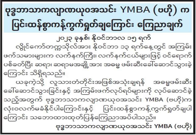 ယခုလတ်တလောကာလတွင် အများပြည်သူအကျိုးစီးပွားပျက်စီးစေရန် မသမာသူလူတစ်စုက လူမှုကွန်ယက်စာမျက်နှာများတွင် သတင်းမှားများ ဖြန့်ဝေလျက်ရှိကြောင်း သိရှိရပါသည်။ အဆိုပါ လူမှုကွန်ရက်စာမျက်နှာများနှင့် အင်တာနက် Website များတွင် ဖြန့်ဝေနေသော ဘဏ်များရှိ အပ်ငွေစာရင်းများမှ ငွေသားထုတ်ယူခြင်းများကို ကန့်သတ်နေကြောင်း ထုတ်ပြန်ချက်များသည် မဟုတ်မမှန်သောသတင်းမှားများသာ ဖြစ်ကြပါသည်။ အလားတူ အချို့ပုဂ္ဂလိကဘဏ်များတွင် ဝန်ထမ်းများကို လစာများကြိုတင် ထုတ်ပေးကြောင်း သတင်းများသည်လည်း သတင်းမှား များဖြစ်ကြပါသည်။