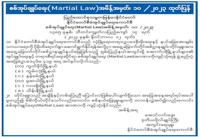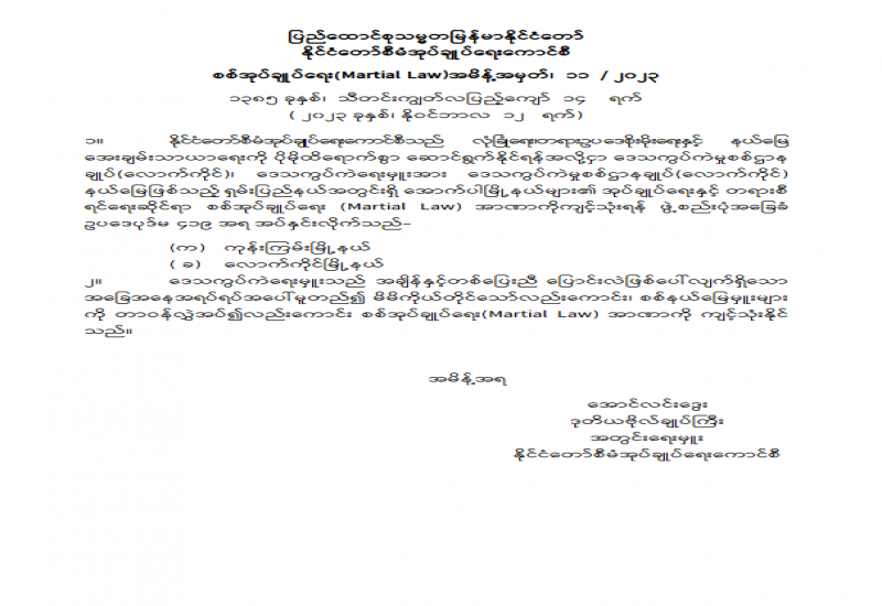 ၁။ နိုင်ငံတော်စီမံအုပ်ချုပ်ရေးကောင်စီသည် လုံခြုံရေး၊တရားဥပဒေစိုးမိုးရေးနှင့် နယ်မြေအေးချမ်းသာယာရေးကို ပိုမိုထိရောက်စွာ ဆောင်ရွက်နိုင်ရန်အလို့ငှာ အရှေ့မြောက်တိုင်းစစ်ဌာနချုပ်၊ တိုင်းမှူးအား အရှေ့မြောက်တိုင်းစစ်ဌာနချုပ်နယ်မြေဖြစ်သည့် ရှမ်းပြည်နယ်အတွင်းရှိ အောက်ပါမြို့နယ်များ၏ အုပ်ချုပ်ရေးနှင့် တရားစီရင်ရေးဆိုင်ရာ စစ်အုပ်ချုပ်ရေး (Martial Law) အာဏာကို ကျင့်သုံးရန် ဖွဲ့စည်းပုံအခြေခံဥပဒေပုဒ်မ ၄၁၉ အရ အပ်နှင်းလိုက်သည်-