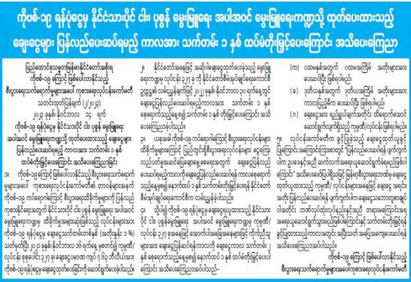 ကိုဗစ်-၁၉ ရန်ပုံငွေမှ နိုင်ငံသားပိုင် ငါး၊ ပုစွန် မွေးမြူရေး အပါအဝင် မွေးမြူရေးကဏ္ဍသို့ ထုတ်ပေးထားသည့် ချေးငွေများ ပြန်လည်ပေးဆပ်ရမည့်ကာလအား သက်တမ်း ၁ နှစ် ထပ်မံတိုးမြှင့်ပေးကြောင်း အသိပေးကြေညာ