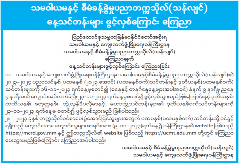 သမဝါယမနှင့် စီမံခန့်ခွဲမှုပညာတက္ကသိုလ်(သန်လျင်)နေ့သင်တန်းများ ဖွင့်လှစ်ကြောင်း ကြေညာ