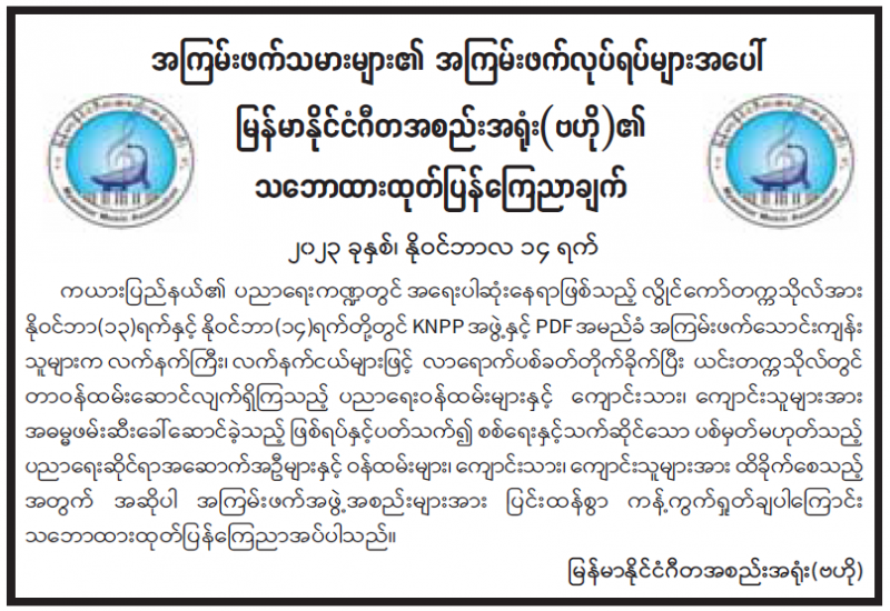 အကြမ်းဖက်သမားများ၏ လုပ်ရပ်များအပေါ် မြန်မာနိုင်ငံဂီတအစည်းအရုံး(ဗဟို)၏ သဘောထားထုတ်ပြန်ကြေညာချက်