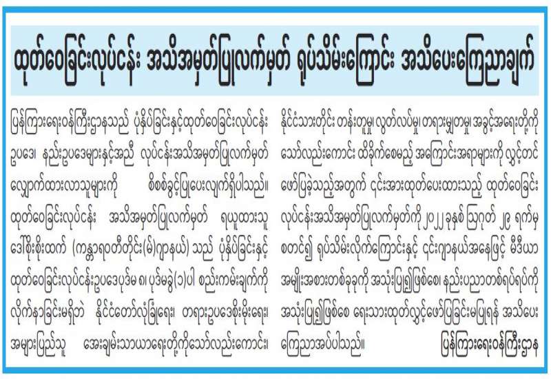ပြန်ကြားရေးဝန်ကြီးဌာနသည် ပုံနှိပ်ခြင်းနှင့်ထုတ်ဝေခြင်းလုပ်ငန်းဥပဒေ၊ နည်းဥပဒေများနှင့်အညီ လုပ်ငန်းအသိအမှတ်ပြုလက်မှတ် လျှောက်ထားလာသူများကို စိစစ်ခွင့်ပြုပေးလျက်ရှိပါသည်။