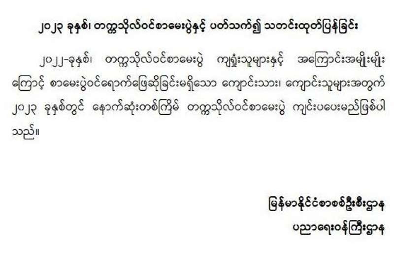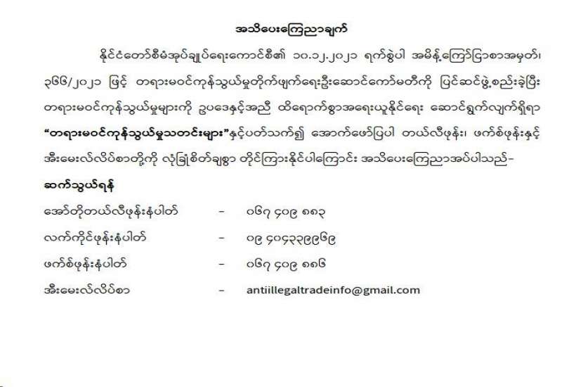 ပြန်ကြားရေးဝန်ကြီးဌာနသည် အရေးကြီးကုန်စည်နှင့် ဝန်ဆောင်မှု ဥပဒေပုဒ်မ ၄ ပုဒ်မခွဲ(ဂ)အရ အပ်နှင်းထားသော လုပ်ပိုင်ခွင့်များကို ကျင့်သုံး၍ (၃၀-၃-၂၀၂၁) ရက်နေ့တွင် တေးသံသွင်းလုပ်ငန်းလုပ်ကိုင် ခွင့်အမိန့်၊ အမိန့်အမှတ် (၂/၂၀၂၁)ဖြင့် တေးသံသွင်းလုပ်ငန်း လုပ်ကိုင်ခွင့်မှတ်ပုံတင် လက်မှတ်များအား (၁)နှစ် သက်တမ်းဖြင့် ခွင့်ပြုပေးလျက်ရှိပါသည်။