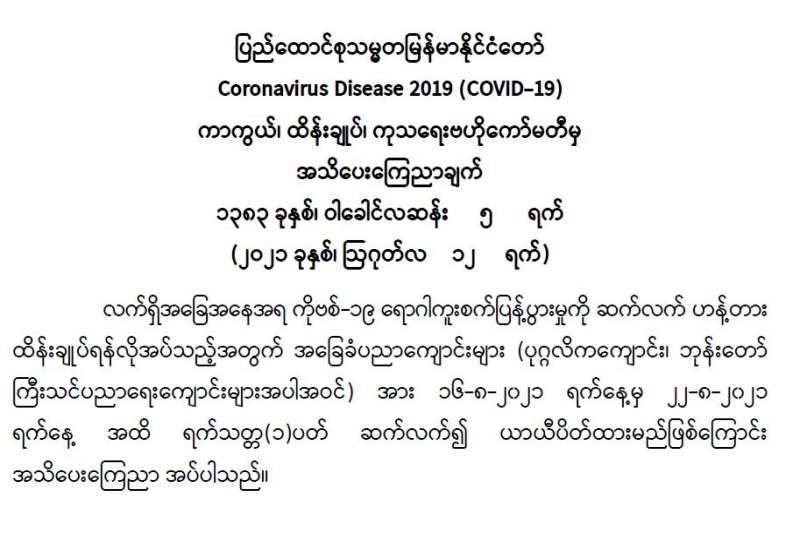 ပြည်ထောင်စုသမ္မတမြန်မာနိုင်ငံတော် Coronavirus Disease 2019 (COVID-19) ကာကွယ်၊ ထိန်းချုပ်၊ ကုသရေးဗဟိုကော်မတီမှ အသိပေးကြေညာချက်