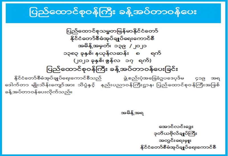 COVID-19 ကာကွယ်၊ ထိန်းချုပ်၊ ကုသရေးဆိုင်ရာ ကျန်းမာရေး အထောက်အကူပြု ပစ္စည်းများ၊ ဆေးဝါးများနှင့် စားသုံးကုန်ပစ္စည်းများကို ဈေးနှုန်းမြှင့်တင်ရောင်းချခြင်း၊ ဖြန့်ဖြူးခြင်း သို့မဟုတ် ဈေးကစားရန် ရည်ရွယ်ချက်ဖြင့် သိုလှောင်ခြင်းတို့ ဆောင်ရွက်နေသည်ကို စိစစ် တွေ့ရှိပါက အရေးကြီးကုန်စည်နှင့်ဝန်ဆောင်မှုဥပဒေအရ အရေးယူ ဆောင်ရွက်သွားမည် ဖြစ်ကြောင်း အသိပေး ကြေညာအပ်ပါသည်။