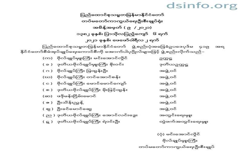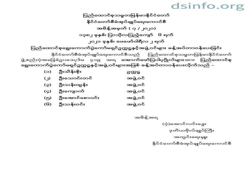 ပြည်ထောင်စုသမ္မတမြန်မာနိုင်ငံတော် နိုင်ငံတော်စီမံအုပ်ချုပ်ရေးကောင်စီ အမိန့်အမှတ်(၇/၂၀၂၁) ၁၃၈၂ ခုနှစ်၊ ပြာသိုလပြည့်ကျော် ၆ ရက် ၂၀၂၁ ခုနှစ်၊ ဖေဖော်ဝါရီလ ၂ ရက် ပြည်ထောင်စုရွေးကောက်ပွဲကော်မရှင်ဥက္ကဋ္ဌနှင့်အဖွဲ့ဝင်များ ခန့်အပ်တာဝန်ပေးခြင်း