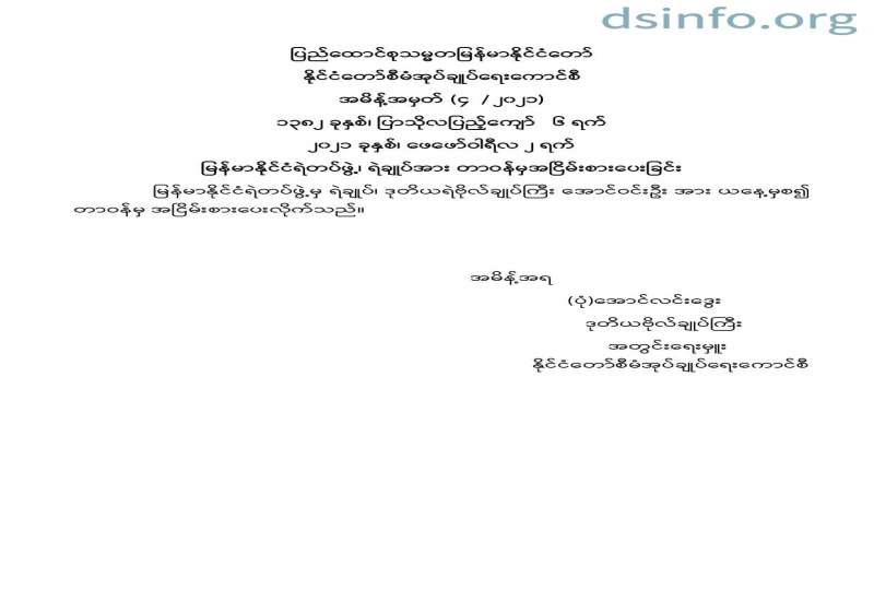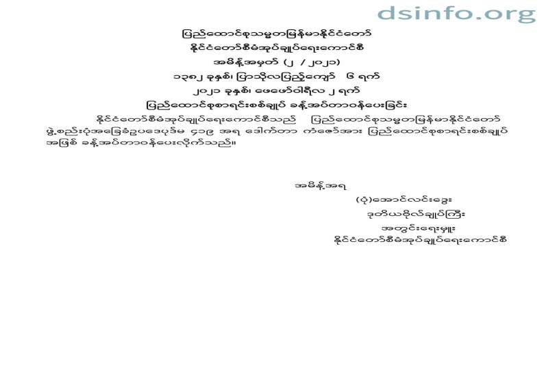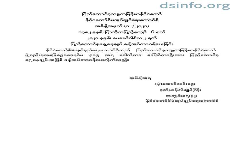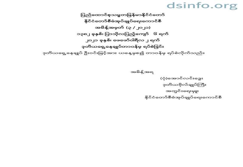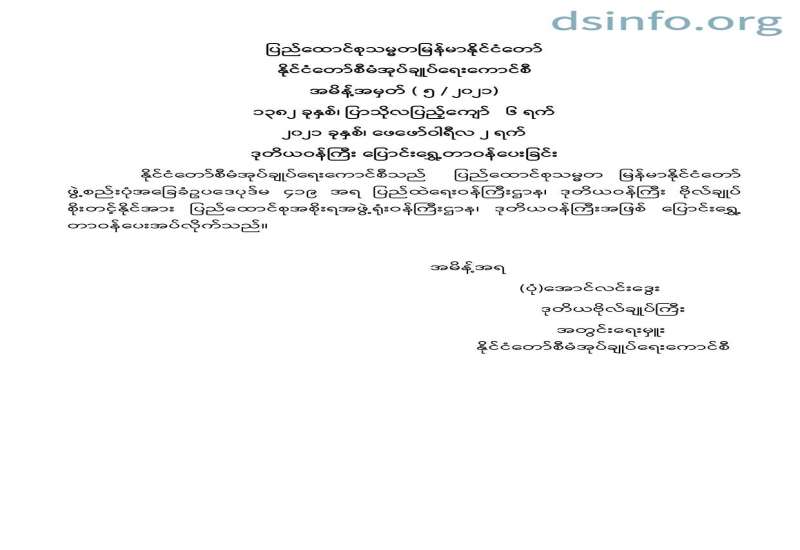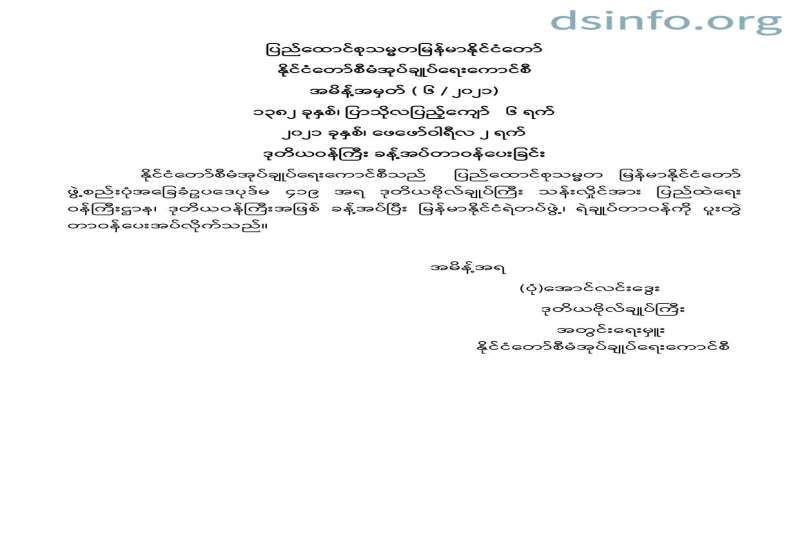 ပြည်ထောင်စုသမ္မတမြန်မာနိုင်ငံတော် နိုင်ငံတော်စီမံအုပ်ချုပ်ရေးကောင်စီ အမိန့်အမှတ်(၂/၂၀၂၁) ၁၃၈၂ ခုနှစ်၊ ပြာသိုလပြည့်ကျော် ၆ ရက် ၂၀၂၁ ခုနှစ်၊ ဖေဖော်ဝါရီလ ၂ ရက် ပြည်ထောင်စုစာရင်းစစ်ချုပ် ခန့်အပ်တာဝန်ပေးခြင်း